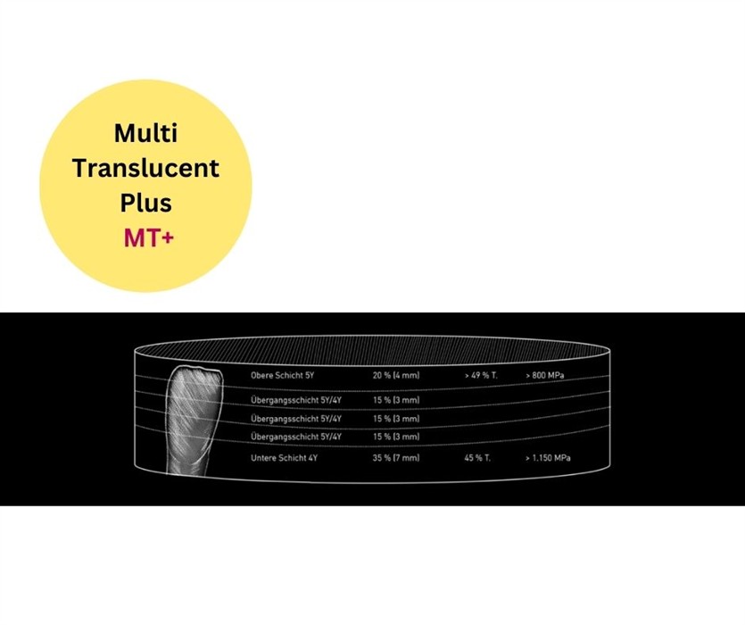 Durch die Kombination aus 4Y (Extra Translucent mit hoher Festigkeit) und 5Y (High Translucent mit hoher Transluzenz) entstehen Verbesserungen bei der ästhetischen Wirkung und Sicherheit für einen uneingeschränkten Indikationsbereich von Restaurationen. Neben einem sanftem Übergang zwischen den Schichten innerhalb der Ronde bzw. Restauration konnten wir eine verbesserte Ästhetik in Bezug zum Vita Classical Shade Guide erzielen.
